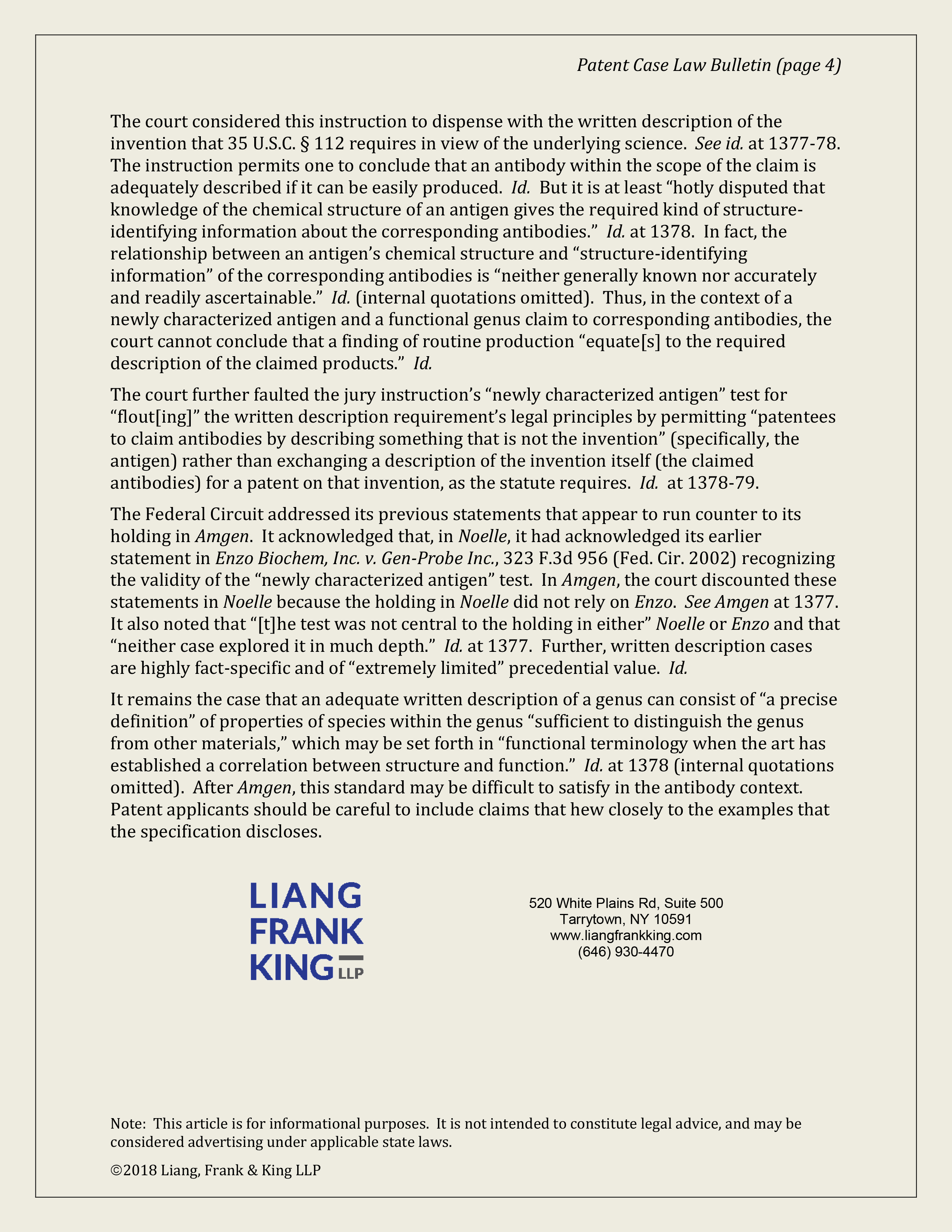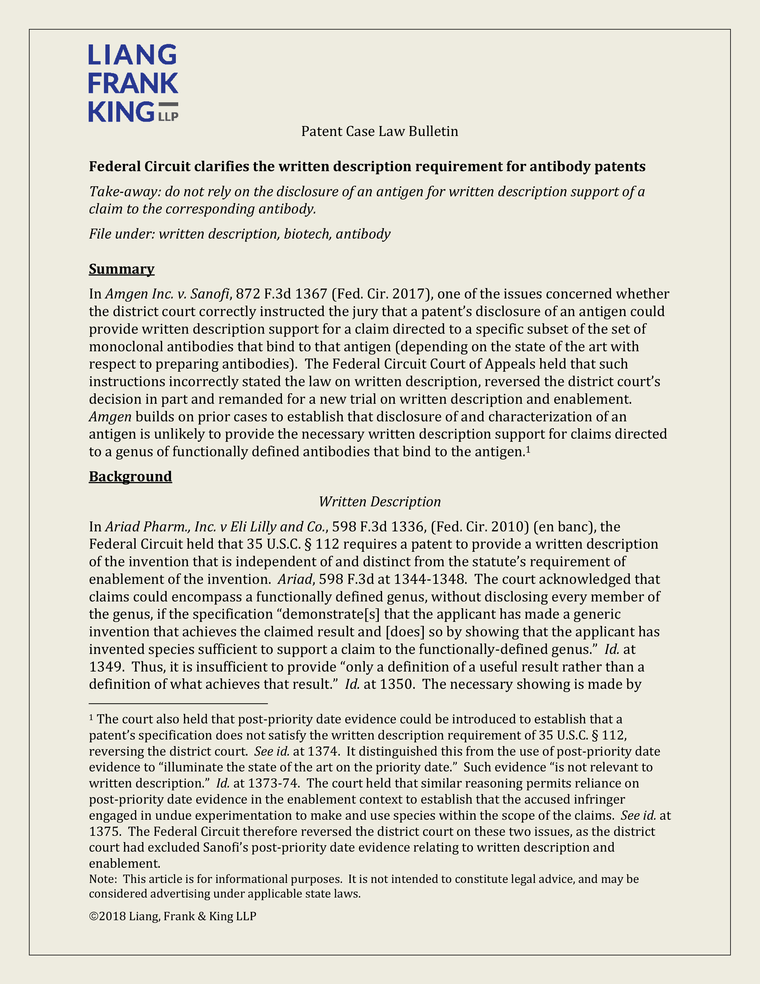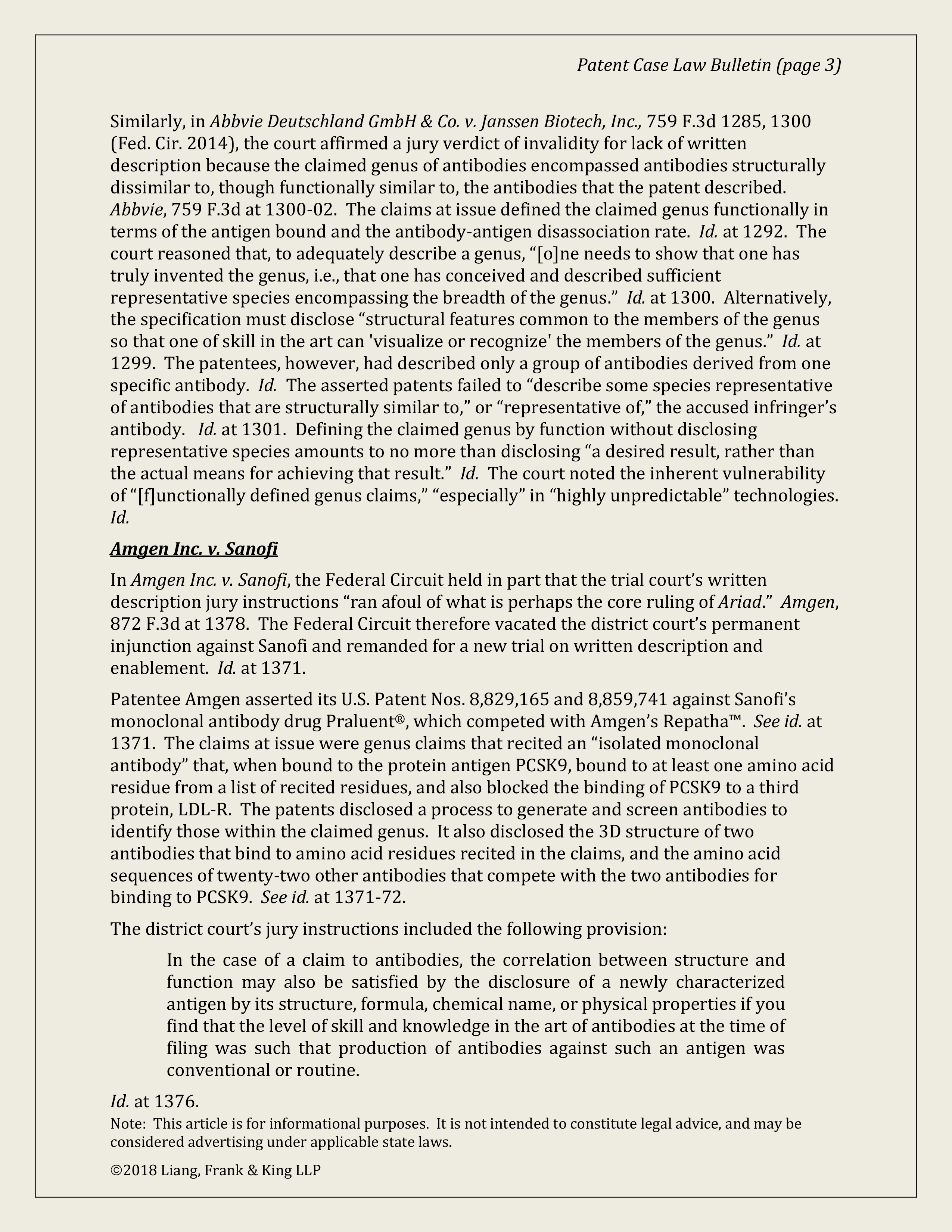 Sanofi (written description/functional antibody claiming)